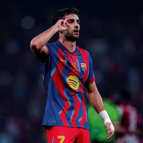 اكتسح الفريق الأول لكرة القدم بنادي برشلونة نظيره أتلتيك بلباو بخمسة أهداف دون مقابل في نصف نهائي كأس السوبر الإسباني المقام حالياً في جدة . وحسم برشلونة الأمور إكلينيكياً في غضون ربع ساعة فقط في منتصف الشوط الأول، حيث سجلها خلالها أربعة أهداف بواسطة فيران توريس وفيرمين لوبيز و روني بردجي ورافينيا، ثم عاد رافينيا […]